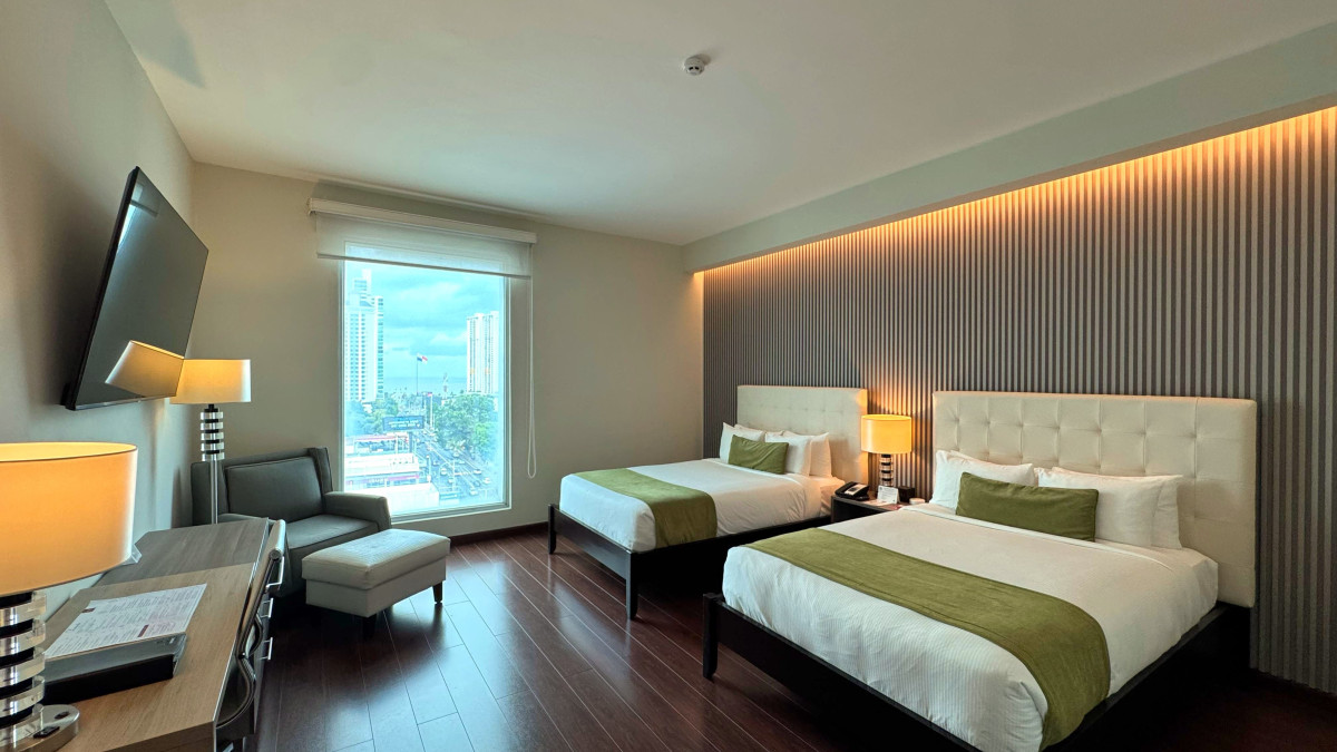 Nuestras exclusivas habitaciones de Dos Camas Dobles Deluxe, ubicadas en los pisos 8 y 9 del hotel, cuentan con 31 m2 / 333.681 pies2 con una impresionante vista del la ciudad y del Océano Pacifico.